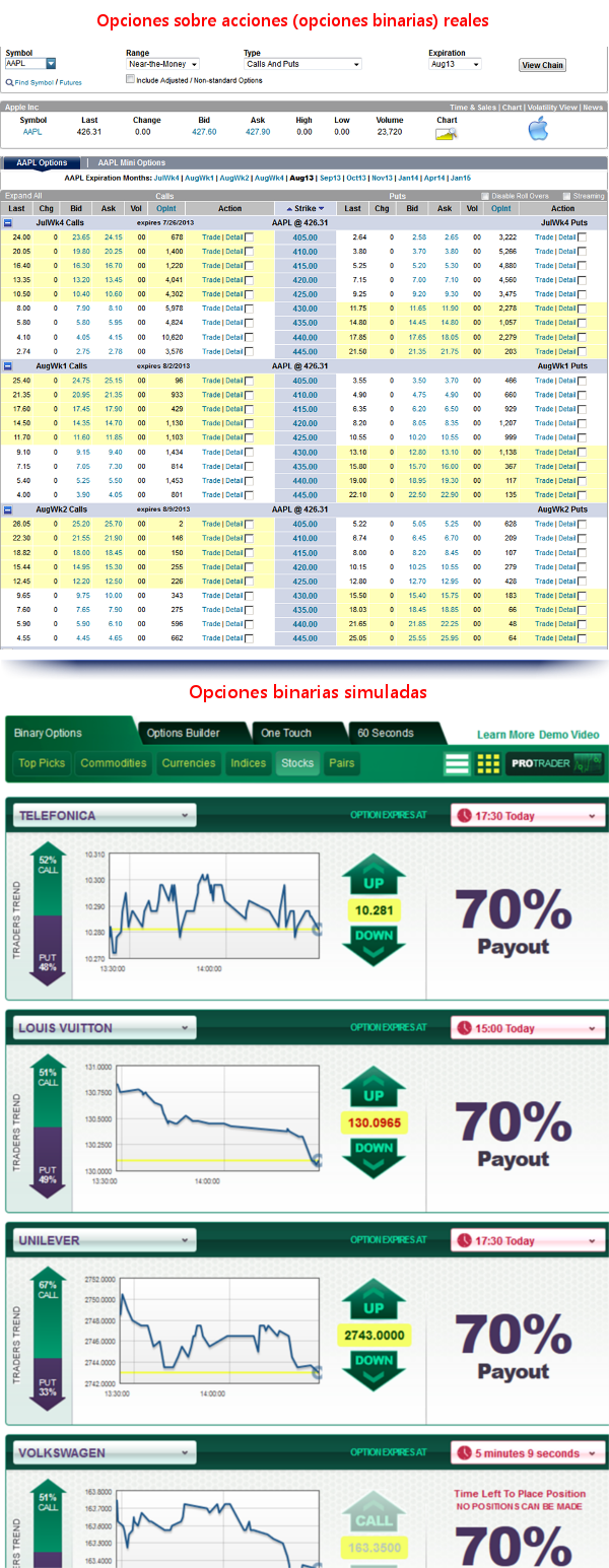 Además en estas dos imágenes siguientes se diferencia como se ven los contratos de opciones sobre acciones en un broker oficial (primer imagen), y como se ven en el software de este otro tipo de empresas (segunda imagen).