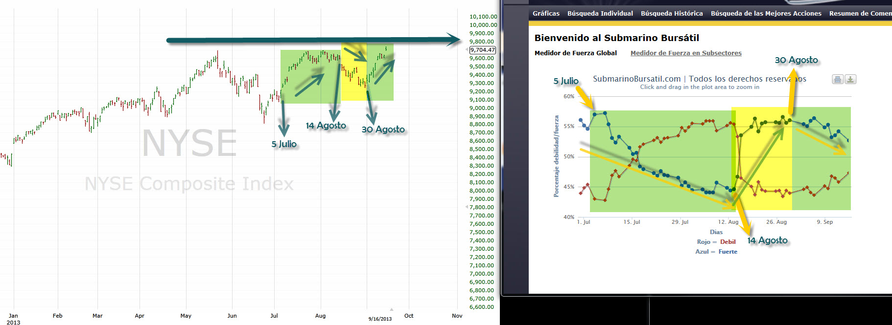 Si nos ubicamos en el día 5 de Julio podemos observar como el índice NYSE continuó su avance a la alza que ya había empezado unos días antes, sin embargo ya a partir de ese día nuestro medidor de fuerza – ubicado a la derecha en la imagen – empezó a indicar una pérdida de fuerza en dicho avance.