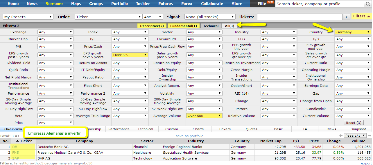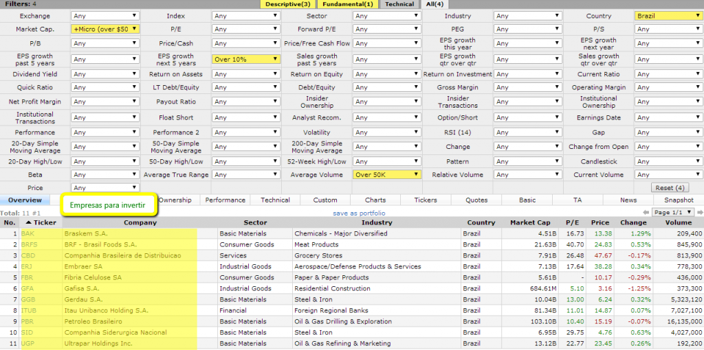 Aquí tienes dos imágenes sacadas del sitio Finviz.com que usamos en nuestra fórmula para encontrar las mejores empresas. Esta imagen contiene algunas de las empresas de Brasil y Alemania que encontramos para invertir: