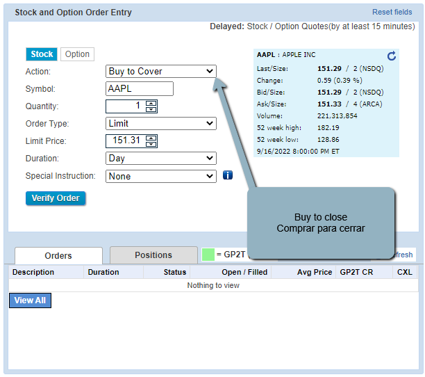 Después, para cerrarla vas a hacerlo con una orden contraria: una orden buy to close o comprar esa acción (que habías vendido antes) para cerrar la operación.