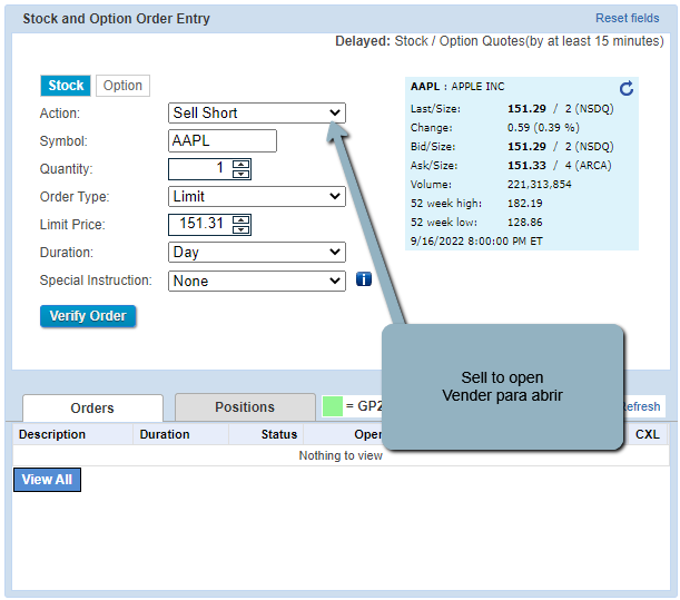Si estás abriendo una operación de ventas cortas (para invertir cuándo la gráfica cae) empiezas vendiendo acciones para abrir la operación, es un sell to open, o una orden de venta de acciones para iniciar una operación.