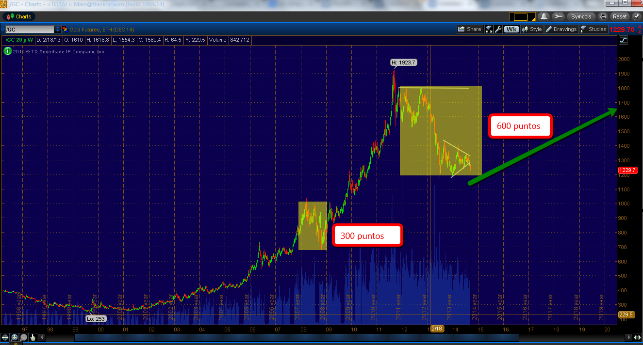 Desde el año 1999 en que tuvo un mínimo, dicho futuro no ha parado de subir, y tan solo en el 2008 presento una oscilación a la baja considerable de 300 puntos que hemos señalado en color amarillo, que no fue más que una oportunidad de compra para continuar su tendencia.