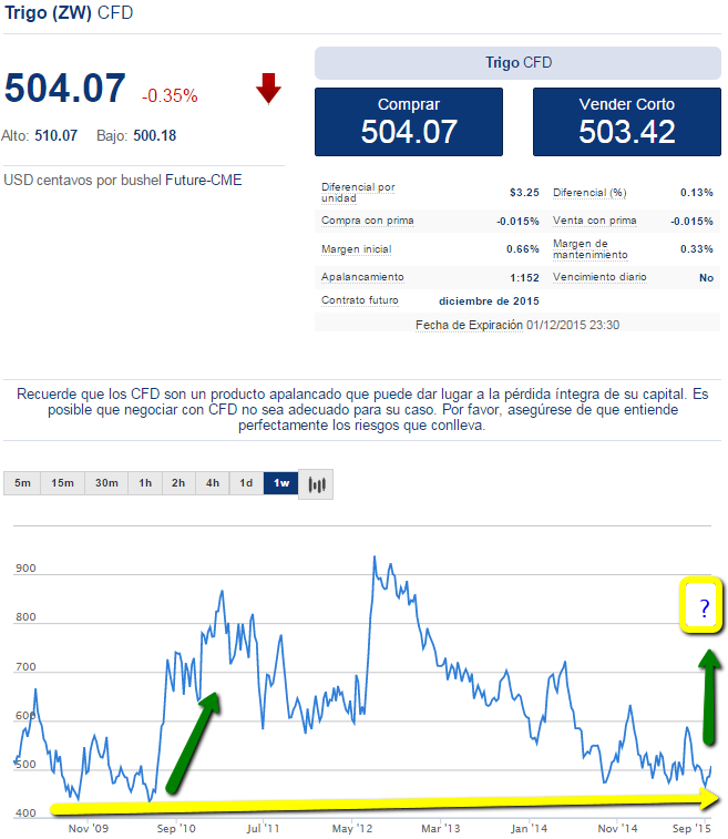 Está claro que el Trigo se vio afectado por dicha crisis, pero nuevamente recordamos que esos máximos que tuvo en el 2007 y 2008 no representaban ninguna señal de compra en los análisis de los profesionales, ya que dicho tiempo de compra había pasado ya hace unos años, y de hecho siempre que una industria demuestra que es fuerte y continua haciendo máximos, debemos esperar a que el precio baje un poco si es que deseamos abrir transacciones, ya que comprar en el máximo representa un riesgo demasiado alto de que pronto se nos pueda venir en contra.