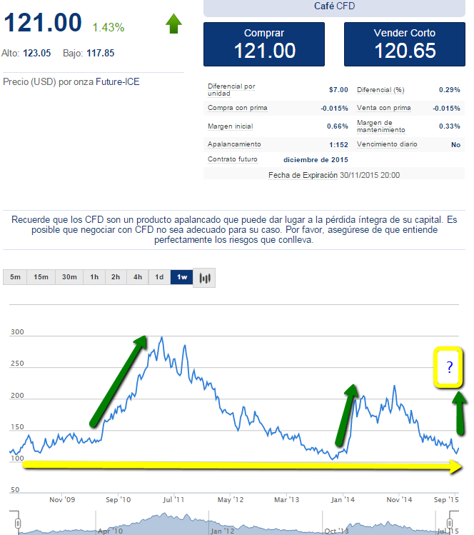 El maíz presenta un comportamiento muy particular al trigo por tanto no nos extenderemos en él, simplemente diremos que aunque ha estado bajando, eso no representa un cambio de tendencia a la baja, ya que si tenemos en cuenta el mínimo y vemos a largo plazo (tal y cual son nuestras intenciones de inversión) el maíz se ha movido en forma horizontal en los últimos años, y está muy cerca de sus mínimos, por lo que en caso de retomar su fuerza a la alza, ofrecerá unos márgenes de ganancia bastante rentables. Basta ver lo que sucedió la última vez que estuvo cerca de estos niveles ahí por el año 2010.