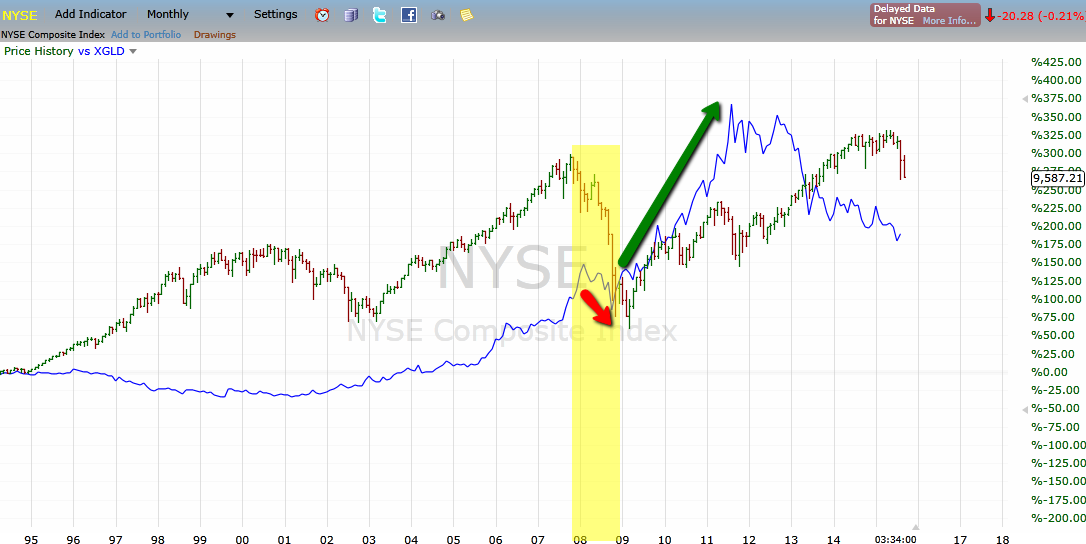 Para probar esto vamos a hablar de la industria del oro, más adelante entraremos en detalle acerca de esta industria, por ahora quiero que nos enfoquemos en la siguiente imagen que compara al índice mundial del oro (barras verdes y rojas) con el índice principal del mercado de USA (línea continua azul), el NYSE.