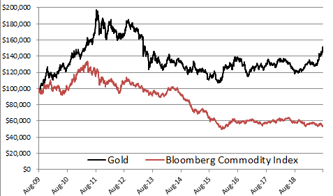 Nos hemos topado con una gráfica que compara cómo se ha comportado la industria del oro por si sola, con respecto a un índice (Bloomberg Commodity Index) que mide en conjunto el resto de las principales industrias del mercado, y los resultados pueden impresionar a cualquiera: Hubiera sido mucho más rentable invertir solamente en oro, en lugar de diversificar en todas la demás industrias.