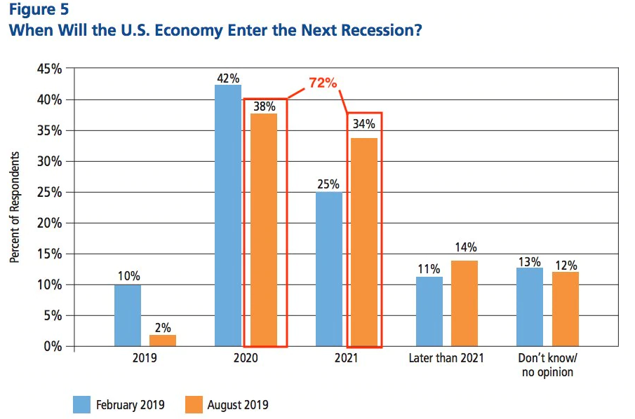 La gráfica (propiedad de la National Association for Business Economics)muestra el resultado de dicha encuesta: El 38% de economistas esperan una recesión en 2020, el 34% la esperan en 2021. La encuesta se realizó el pasado Febrero 2019, antes de las noticias de la Reserva Federal y de que los mercados presentaran las primeras caídas y también concluye que el 42% de los economistas piensan que las economías y mercados empezarán a caer en 2020 mientras que el 34% piensan que empezará en el 2021.