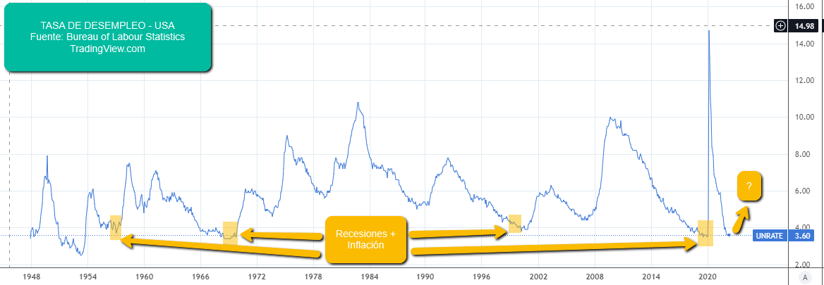 El segundo factor es que aunque después de la pandemia el desempleo estuvo en un máximo nunca antes visto, ahora mismo ha bajado y se han recuperado muchos puestos de trabajo, poniéndonos de nuevo en esa misma situación de las anteriores etapas de inflación, justo antes de que el desempleo vuelva a subir. Ese será el factor detonante de la crisis: Ver la bolsa caer (a causa del incremento de tasas de interés de la FED en la actual inflación) y empezar a ver como las empresas despiden cada vez más empleados causando una nueva recesión.
