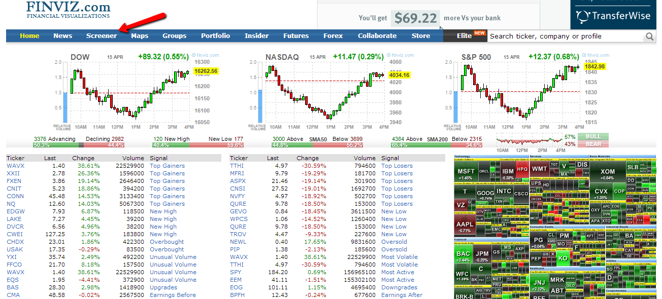 Uno de estos softwares gratuitos es el del sitio web Finviz.com que permite aplicar una serie de filtros muy completos a todas las empresas del mercado para poder escoger lo mejor de lo mejor.
