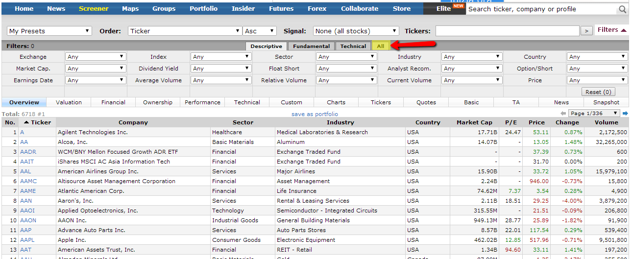 Estando en el Screener de Finviz vamos a hacer clic en la pestaña que dice All, para decirle que nos muestre todos los tipos de filtros que podemos aplicar a todas las empresas del mercado