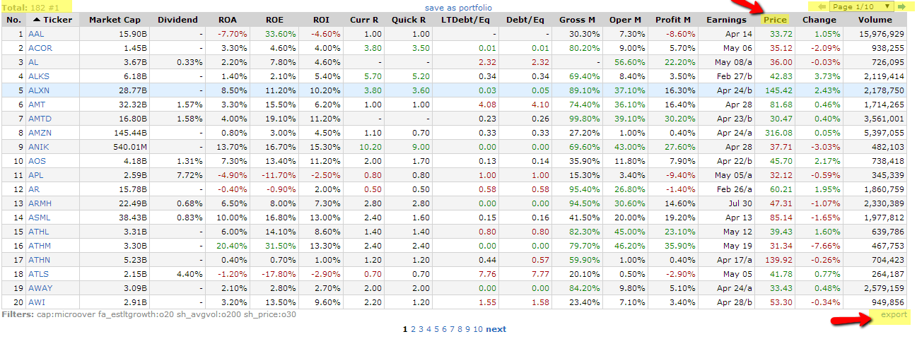 También Finviz nos permite reordenar nuestra lista haciendo clic en cualquiera de las columnas, por ejemplo en la de precio para ordenarlas desde las más baratas hasta las mas caras.