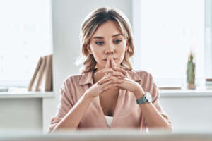 Lost in thoughts. Thoughtful young woman in smart casual keeping hands clasped while sitting in modern office