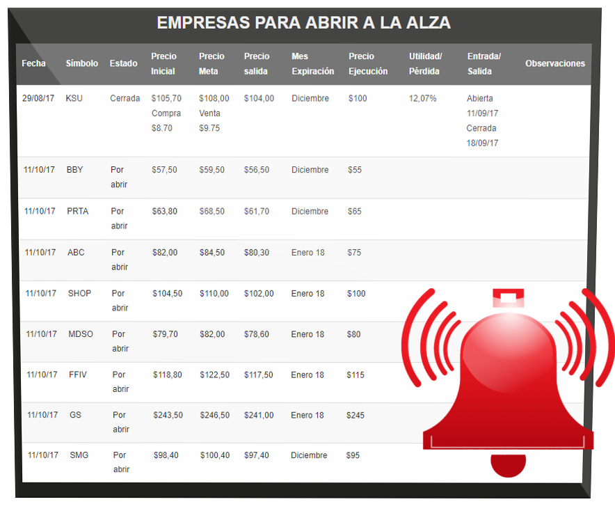 Nuestras servicio de alertas consiste en una lista de alrededor de 7-9 empresas (dependiendo de la calidad que ofrezca el mercado) que publicamos a todos nuestros miembros de la subscripción VIP. Estas empresas contienen todos los detalles sobre precios de entrada, salida y demás detalles a tener en cuenta para poder administrar la transacción de forma eficiente y con el menor riesgo.