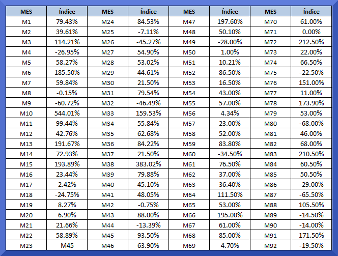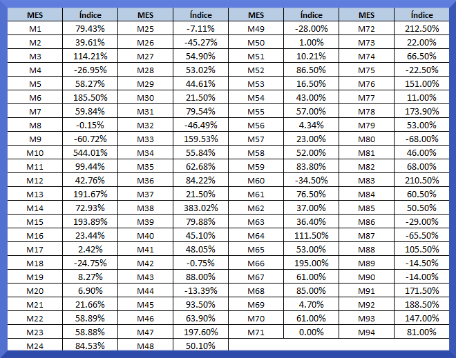 Hemos creado un índice de retornos para que puedas realizar la comparación de tus retornos sin necesidad de tener que buscar en ningún otro lugar, otro índice que se parezca a tus transacciones: